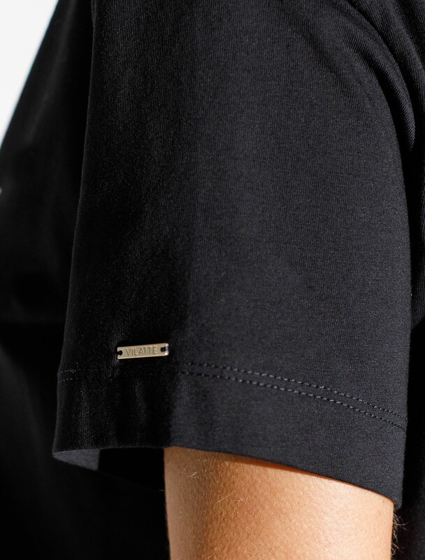 Стильная базовая футболка черного цвета с серебристым принтом фольгой выполнена из плотного хлопка с эластаном для комфортной посадки на любую фигуру.  Прямая футболка классического кроя с круглым вырезом, прекрасно подходит для разных типов фигуры, в том числе и на большие размеры. Мягкость хлопка вместе с небольшой долей эластана гарантирует идеальную посадку и свободу движений. Легкая натуральная дышащая ткань премиального качества делает футболку с коротким рукавом идеальным вариантом для повседневной носки дома, на работу или офис. Однотонная футболка дополнена авторским аккуратным принтом с минималистичной надписью, который придает праздничный и элегантный вид без лишней вычурности. Блестящий принт аккуратно украшает, добавляя изысканный акцент и создавая легкий мерцающий эффект. Перевод надписи Trust the magic of new beginnings -  Дооверьтесь магии новых начинаний.