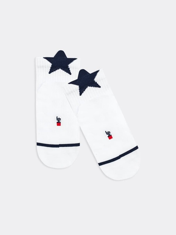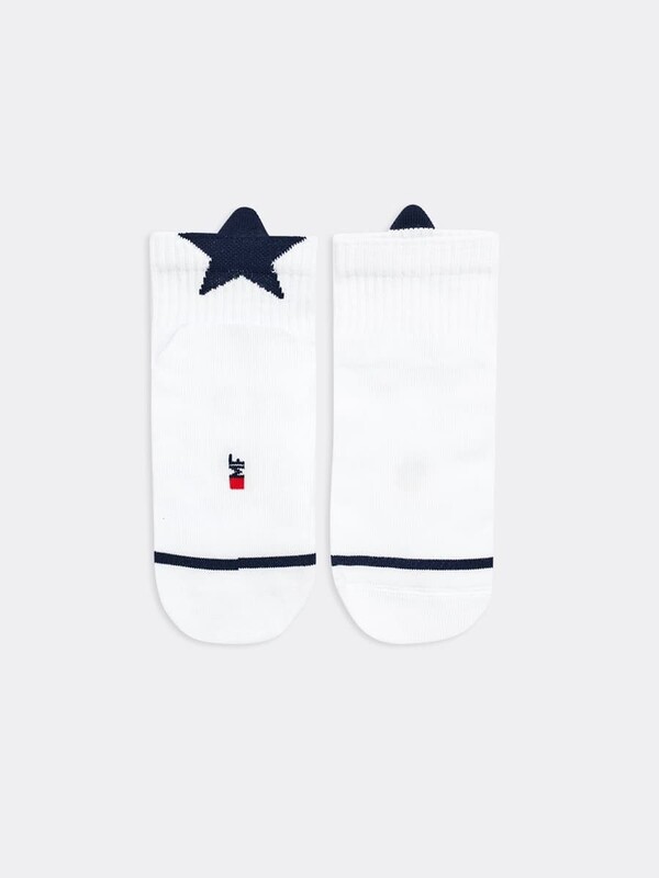 Гладкий детский носок с резинкой средней высоты и рисунком в виде контурной звезды, выступающей за границы носка. Необычно!