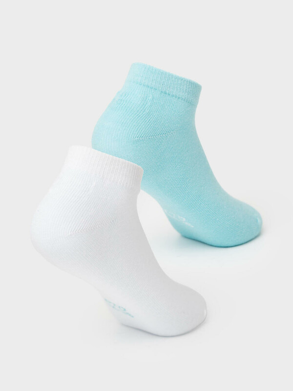 Комплект из двух пар укороченных носков для девочки подростка. Каждая пара дополнена прозрачным силиконовым принтом на пятке, который помогает носкам не сползать. Внизу стопы жаккардовая надпись с указанием размера. Материал — мягкий хлопковый трикотаж.