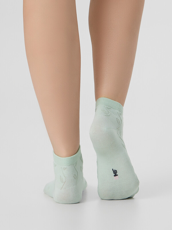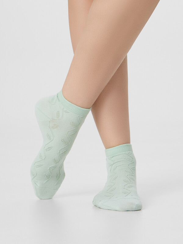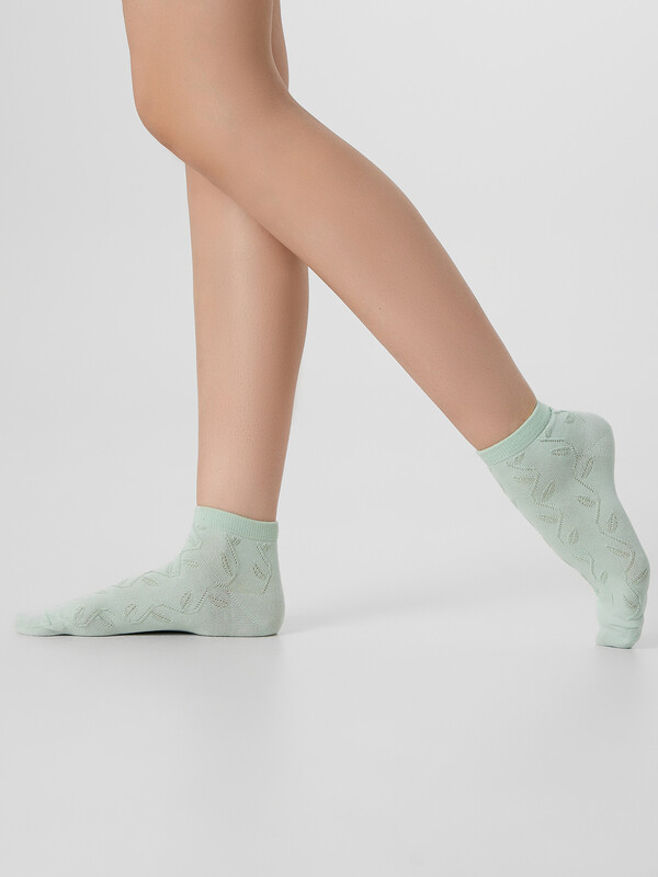 рис. 3124 Женские укороченные, однотонные носки,выработанные перекидным переплетением с рельефным рисунком в виде веточек.