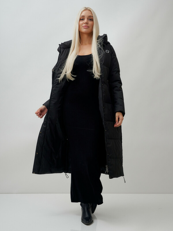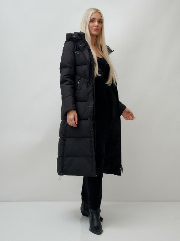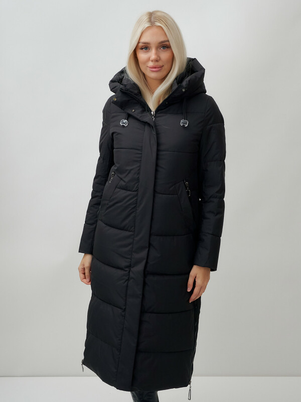 Главная страница - Каталог - Женская одежда оптом - Женская верхняя одежда - Женская верхняя одежда осень-зима - Пальто утепленное стеганное зимнее с капюшоном женское черного цвета 9607Ch