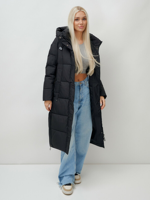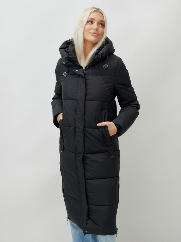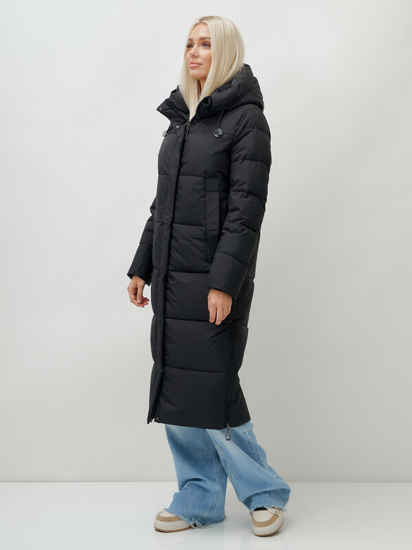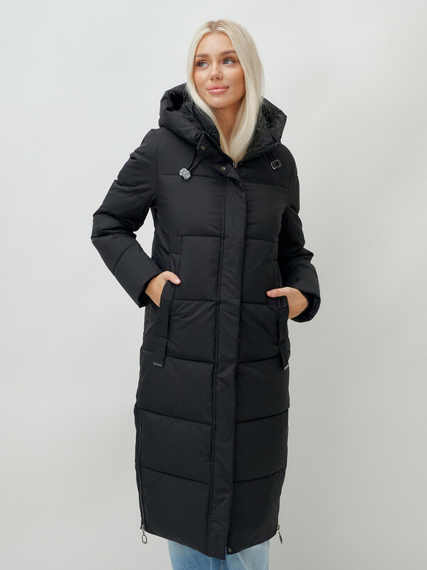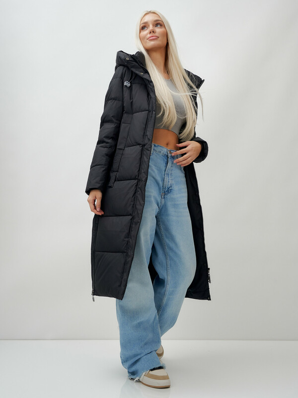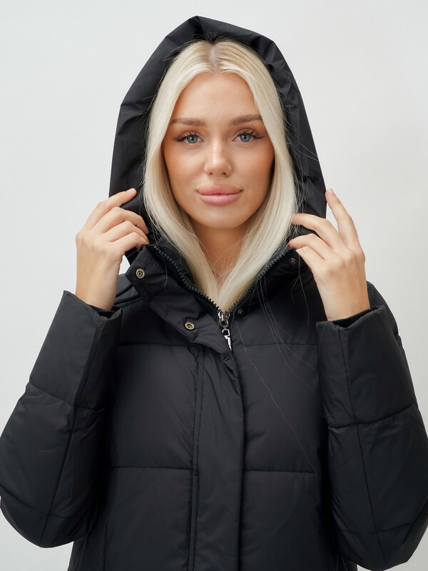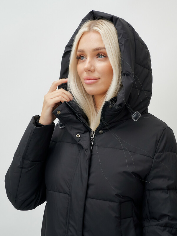 Главная страница - Каталог - Женская одежда оптом - Женская верхняя одежда - Женская верхняя одежда осень-зима - Пальто утепленное стеганное зимнее с капюшоном женское черного цвета 9608Ch