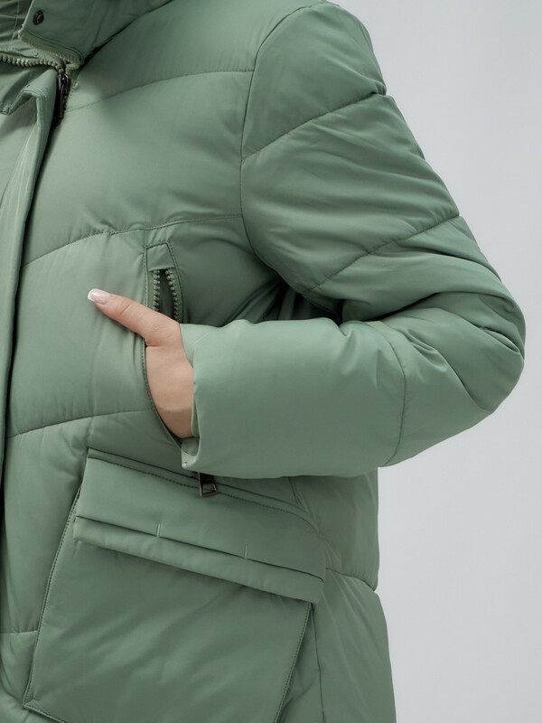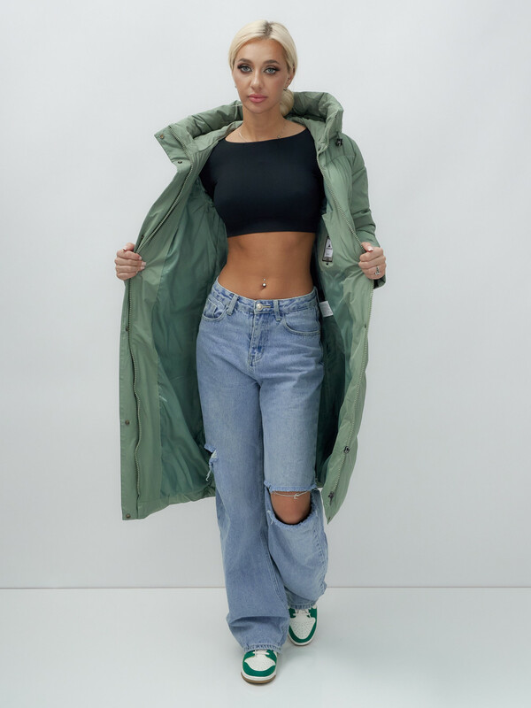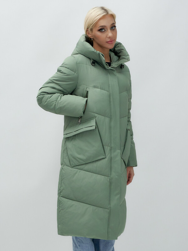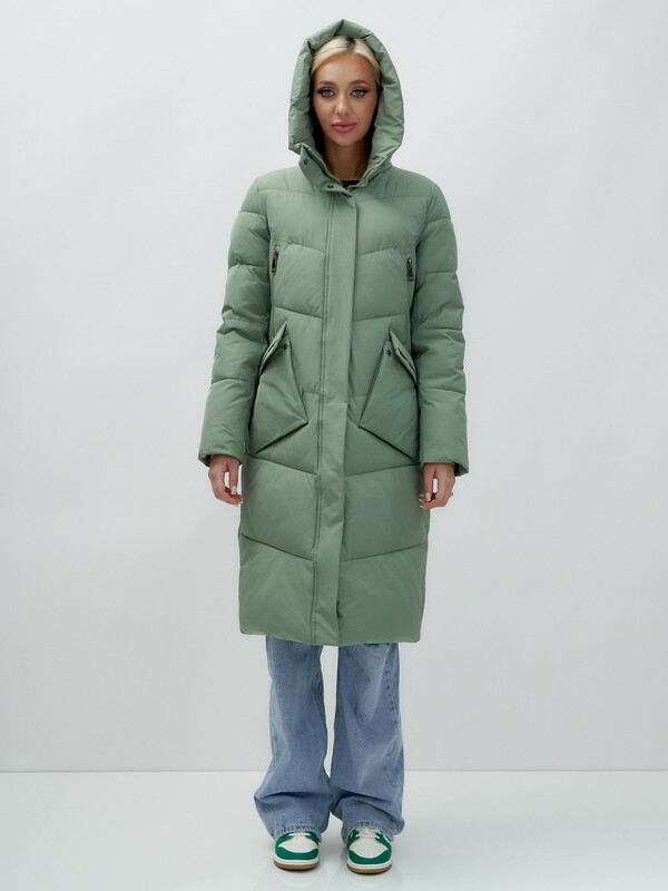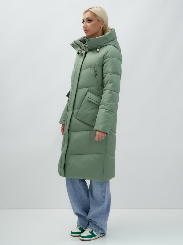 Главная страница - Каталог - Женская одежда оптом - Женская верхняя одежда - Женская верхняя одежда осень-зима - Пальто утепленное стеганное зимнее с капюшоном женское зеленого цвета 9639Z