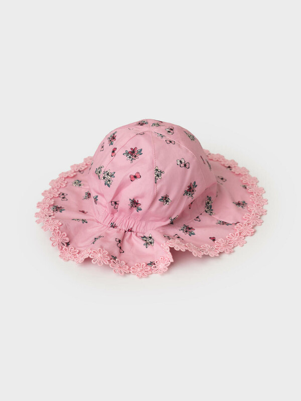 Детская панама для девочки. Модель выполнена в нежно-розовом цвете с красивым мелким рисунком — на ткани изображены цветочки, бантики и ягодки. Широкие поля украшены воланом, который по краю отделан кружевной тесьмой. Панама хорошо сидит на голове благодаря эластичной вставке на затылке и завязкам.