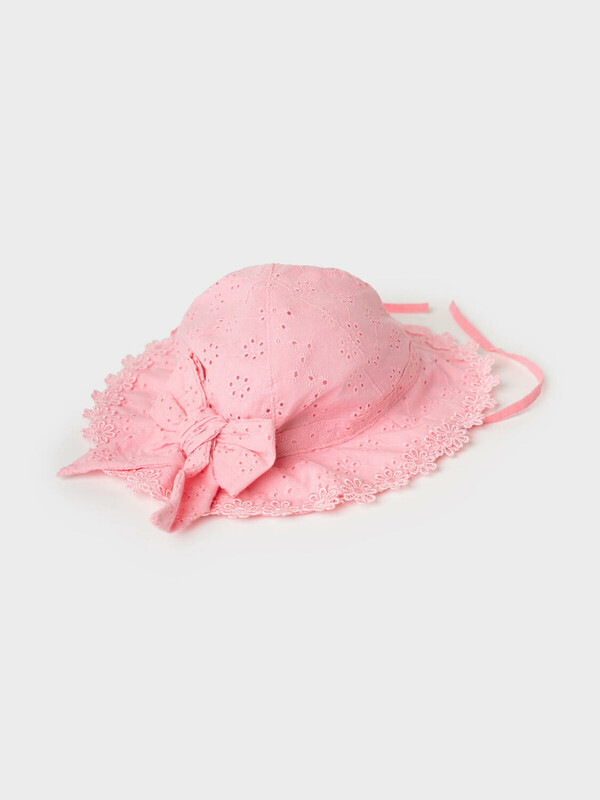 Летняя детская панамка для девочки. Модель с мягкими полями и крупным декоративным бантом сзади. Выполнена из тонкой хлопковой ткани с ажурным цветочным узором. По краю полей идет аккуратная кружевная отделка, которая придаёт изделию нежный и нарядный вид. Сзади предусмотрена эластичная резинка для лучшей посадки на голове. Панамка фиксируется с помощью завязок.