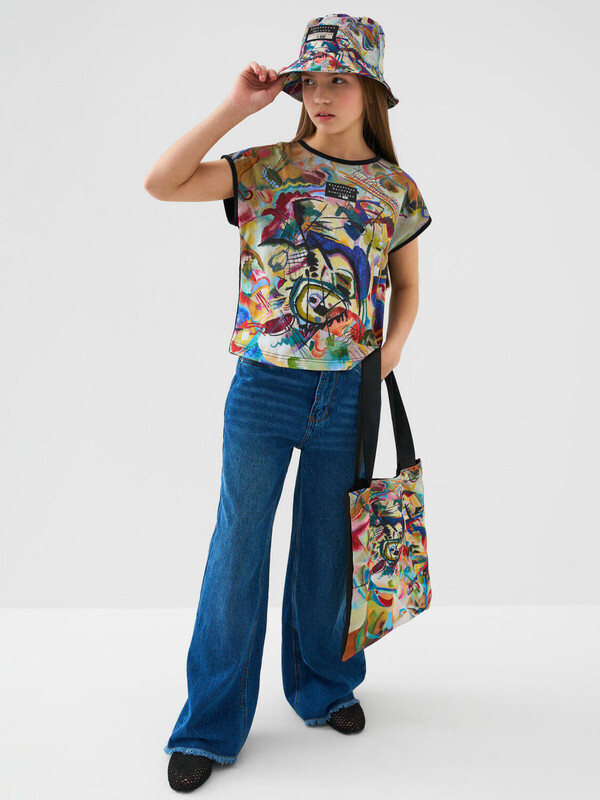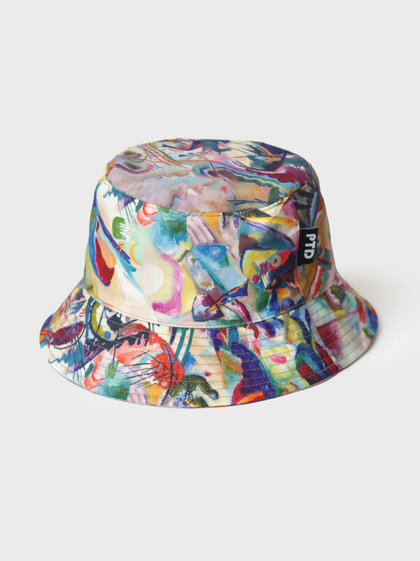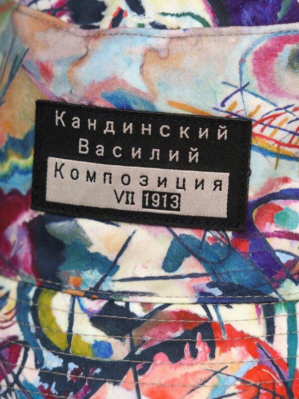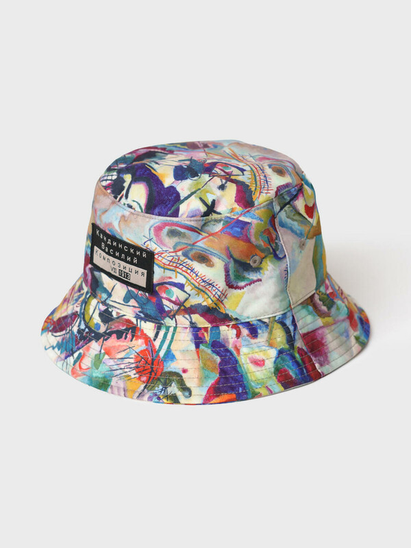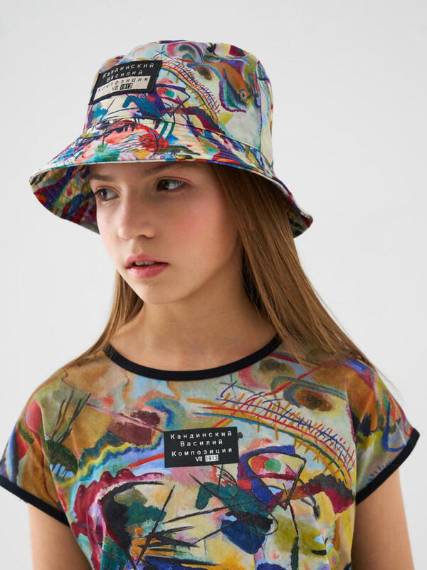 Стильная панама для девочки подростка. Модель с ярким художественным принтом, вдохновлённым абстрактной картиной Василия Кандинского "Композиция VII" (1913). Изделие украшено жаккардовой нашивкой с указанием автора и названия произведения, а также небольшим лейблом бренда. Панама выполнена из ткани с полноцветным рисунком и имеет металлические люверсы по бокам для вентиляции. Внутри — однотонная подкладка.