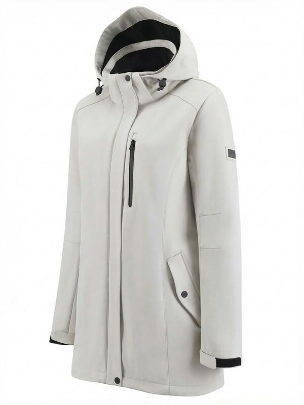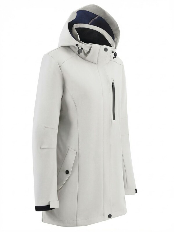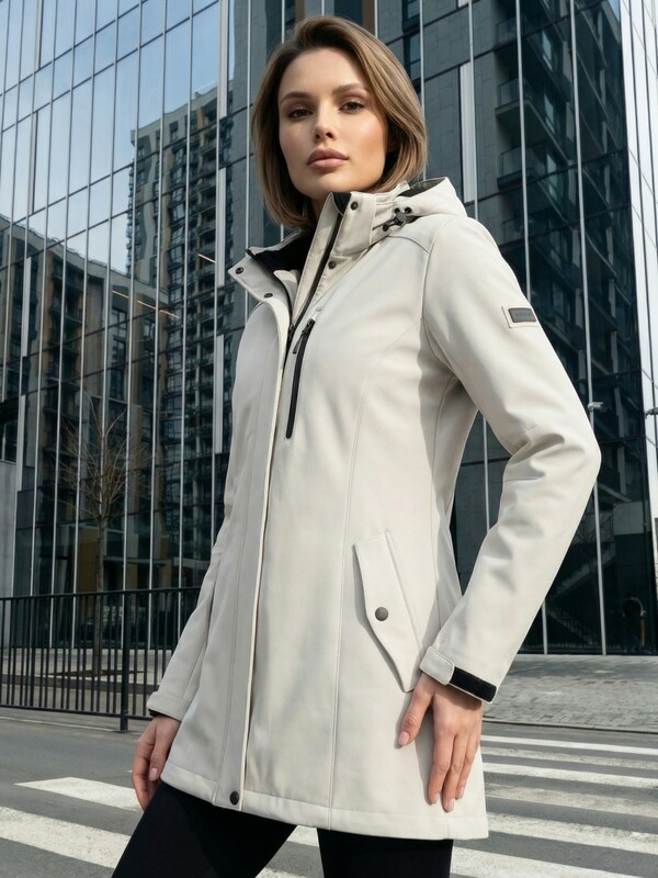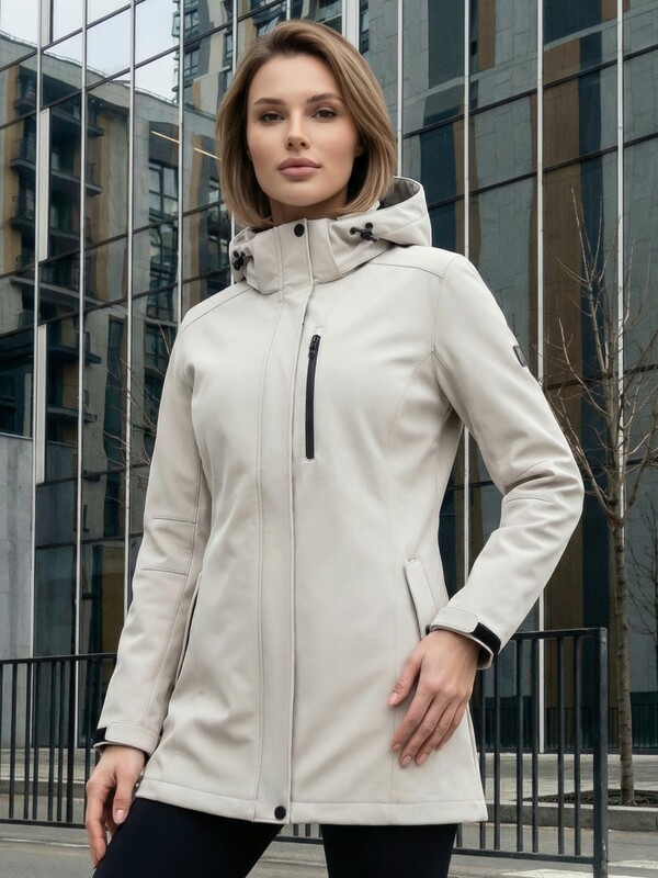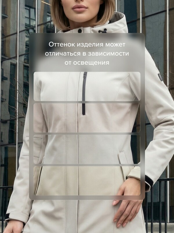 Главная страница - Каталог - Женская одежда оптом - Женская верхняя одежда - Женская верхняя одежда весна-осень - Парка женская софтшелл виндстоппер удлинённая с капюшоном белого цвета 9618_1Bl