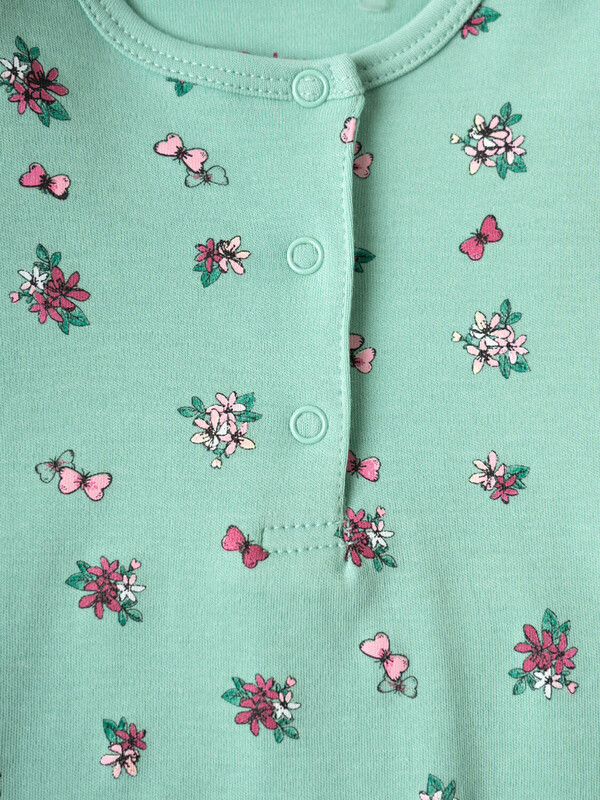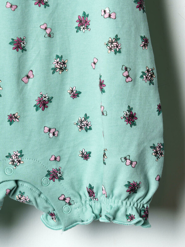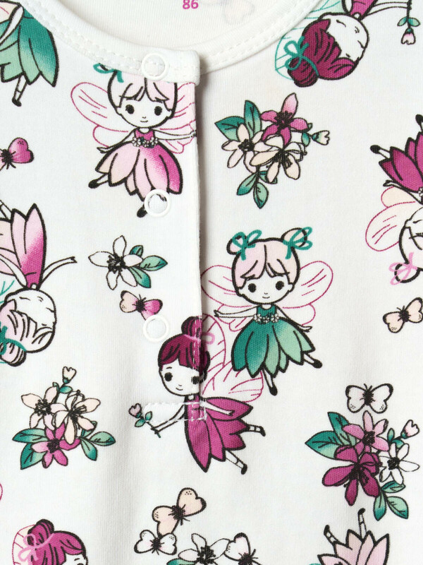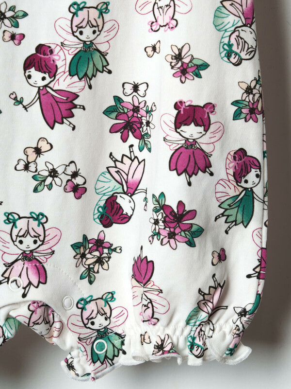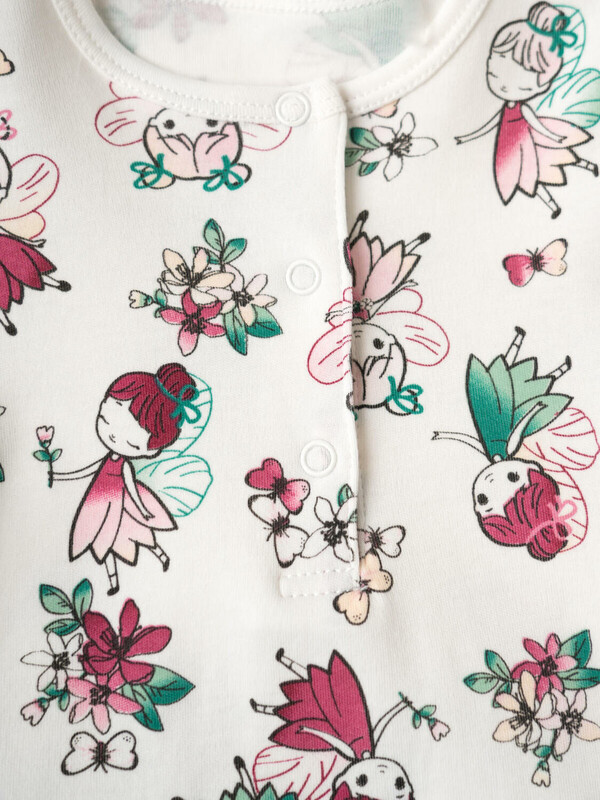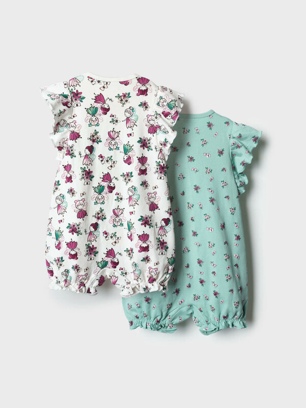 Набор из двух песочников для новорождённой девочки. Один песочник украшен принтом с милыми феями и цветами на светлом фоне, другой — с мелкими ягодками и цветами на зелёном фоне. Рукава выполнены в виде крылышек и придают изделию нежный и воздушный вид. Песочники застёгиваются на кнопки спереди и снизу, что удобно для переодевания малыша. Внизу изделия используется эластичная сборка, создающая мягкую посадку вокруг ножек. Изделия выполнены из мягкого и дышащего, хлопкового трикотажа интерлок.