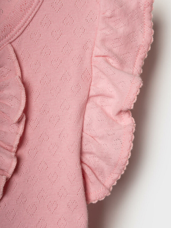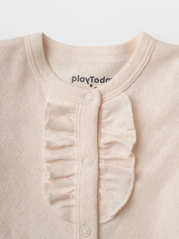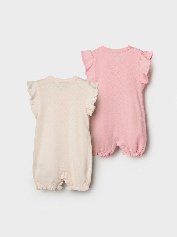 Набор из двух песочников для новорожденной девочки. Изделия выполнены в двух нежных расцветках — кремовой и розовой — с мелким узором. Спереди расположена декоративная рюша, а по бокам — крылышки. По краю рукавов и горловины — аккуратная кружевная отделка. Песочники застегиваются на кнопки спереди и между ножек, что удобно для переодевания. Низ изделия собран на мягкую резинку. Основной материал — мягкий трикотаж из 100% хлопка.