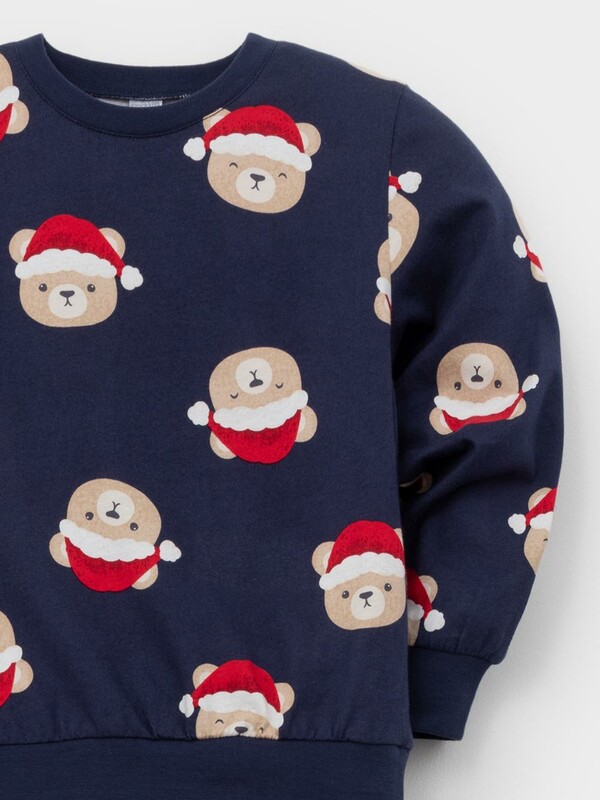 Новогодняя пижама из натурального хлопка. Джемпер с длинными втачными рукавами и брюки с эластичной резинкой в поясе. Мягкие манжеты на рукавах и по низу брюк. Пижама отлично подойдёт для создания уютных домашних образов или в качестве подарка на Новый год и Рождество. Оригинальная набивка выполнена из стойких текстильных гипоаллергенных красителей. Изделие сохраняет цвет и форму после многократных стирок. Все трикотажные полотна производятся в соответствии с нормами швейцарского сертификата ЭкоТекс.