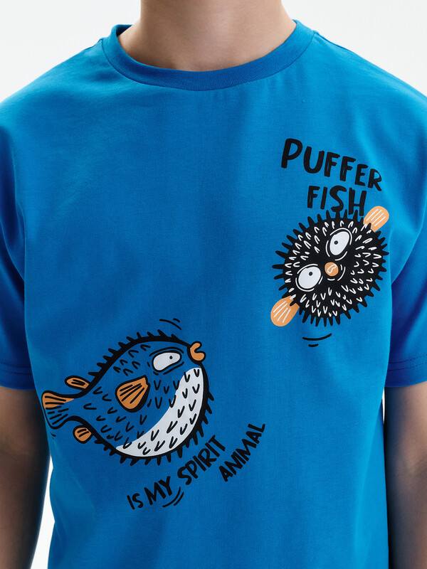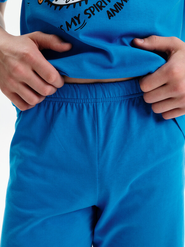 Стильная и уютная пижама для мальчика. В составе ткани 100% хлопка — идеально для детской домашней одежды! Футболка и удлиненные шорты, плечо спущено, рукава широкие и свободные — пижама на мальчика очень удобна для сна. Широкая и мягкая резинка в поясе шортов не перекручивается и не давит. Отделка горловины из эластичной рибаны — она не растягивается, ребёнку удобно надевать и снимать пижаму. Перевод надписей: "рыба фугу мое тотемное животное"