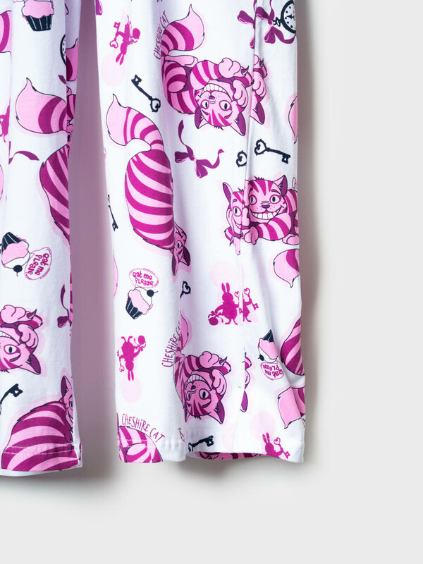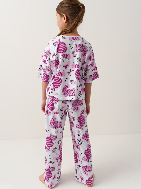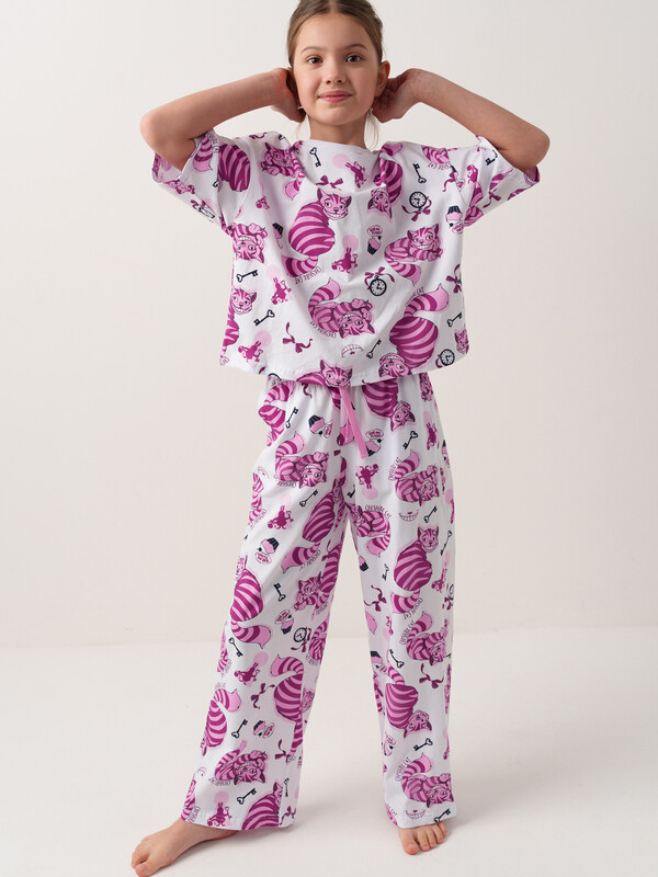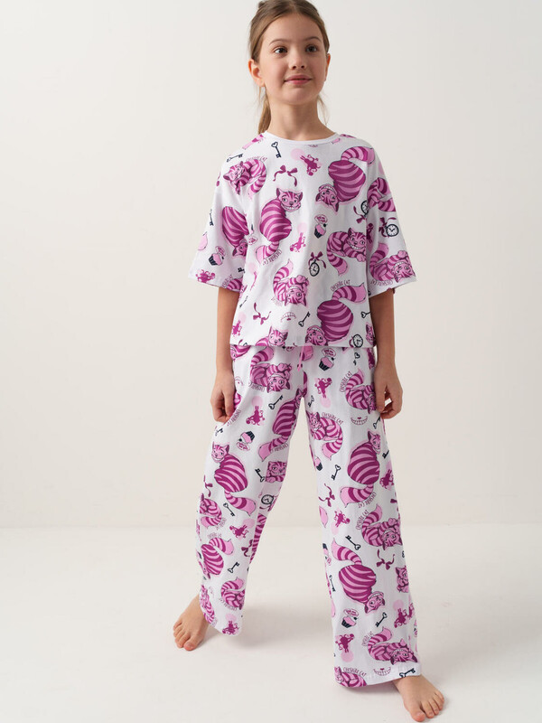 Пижама для девочки подростка. Комплект состоит из футболки оверсайз с короткими рукавами и длинных широких брюк. Изделие украшено ярким принтом с Чеширским котом, часами и ключами. В поясе брюк предусмотрен удобный шнурок для регулировки. Материал — мягкий и комфортный хлопковый трикотаж.