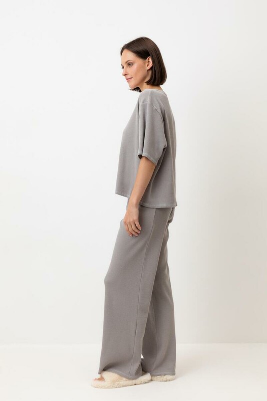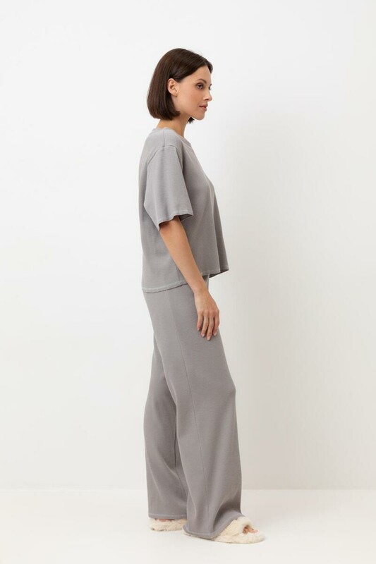 Комплект из объемного трикотажа с добавлением эластичных волокон. Свободный силуэт, мягкий пояс и отсутствие боковых швов на брюках обеспечат комфорт во время сна и отдыха.