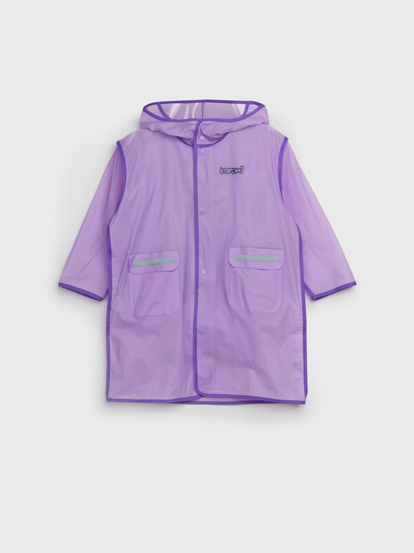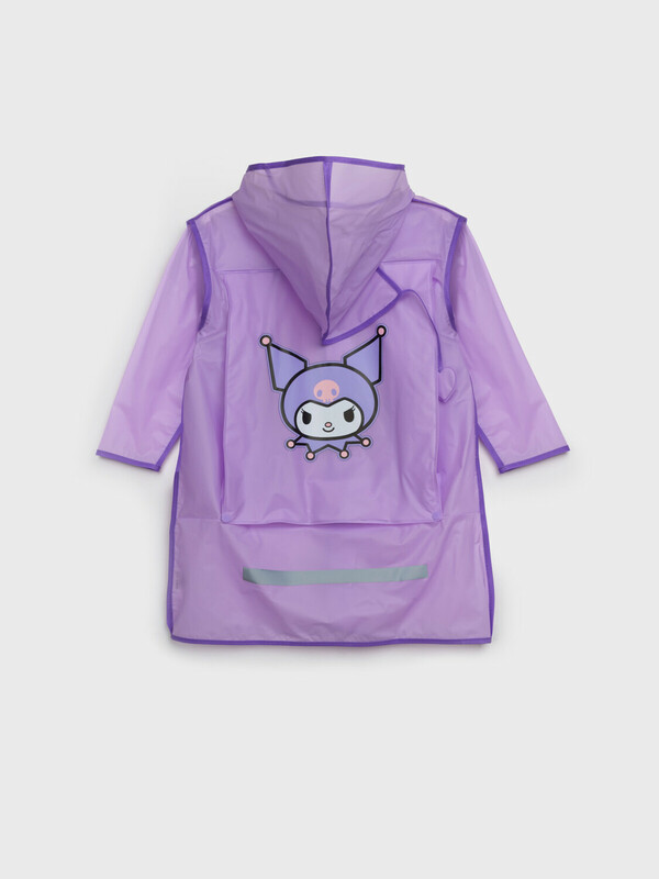 Дождевик детский с козырьком с KUROMI для девочки. Застежка на кнопки. Материал ЭВА. Без подкладки. Модель имеет спереди два накладных кармана с клапаном. Сзади имеется объемный клапан на кнопках для изменения объема плаща под рюкзак. Есть светоотражающие элементы спереди и сзади. Добавлена петелька под капюшоном с внешней стороны, чтобы остальные вещи на вешалке не намокали. Модель идеально сочетается с резиновым сапогам и зонтом из коллекции. В комплекте идет непромокаемая сумочка.