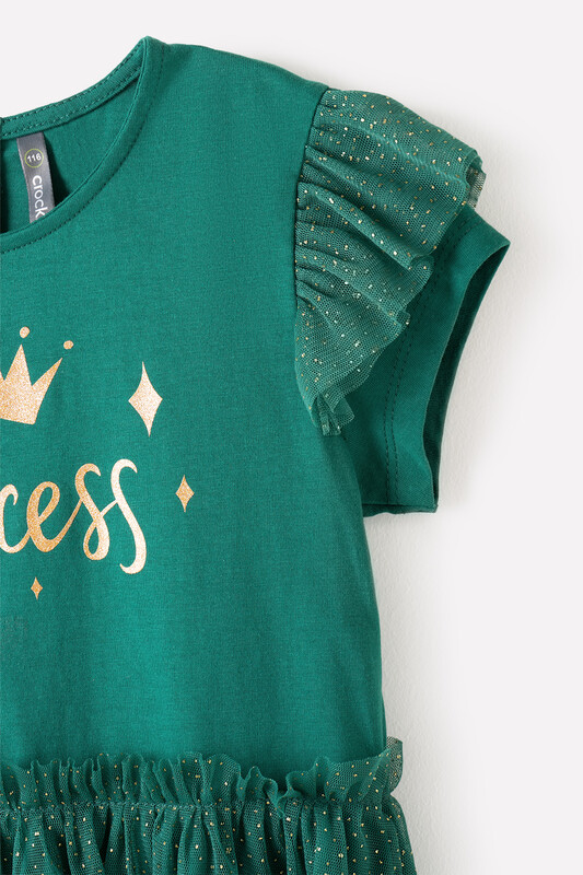 Нарядное тёмно-зелёное платье. Лиф из супрема украшен принтом. Верхний слой юбки сделан из сетки с золотыми блёстками, на талии красивая сборка. На рукавах оборка из сетки. До 98 размера для удобства при одевании застёгивается на спинке с помощью кнопок.