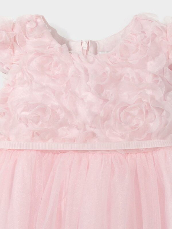 Нарядное платье с короткими рукавами для девочки. Рукава и лиф изделия изготовлены из атласа и украшены объёмной сеткой с лепестками. Юбка сшита из лёгкой блестящей сетки. Для удобства одевания на спинке предусмотрена застёжка на молнию. С помощью ленты можно регулировать ширину изделия по талии. Платье сохраняет форму и стойкий цвет после многочисленных стирок и идеально подходит для праздников и фотосессий.