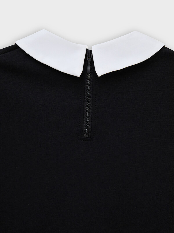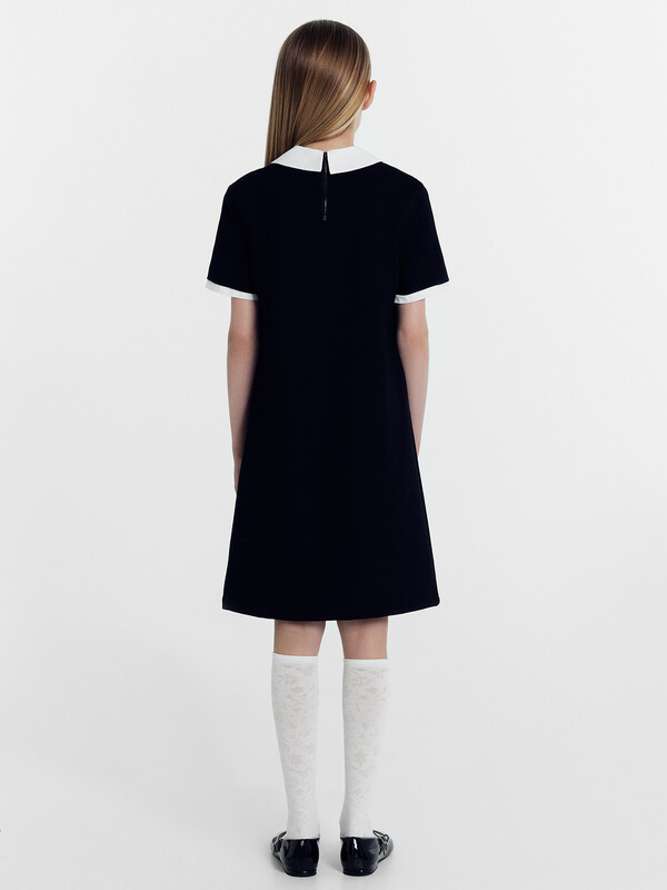 Платье полуприлегающего силуэта, длиной выше колен. Перед и спинка цельнокроенные. Горловина круглой формы. Обработана воротником из текстильного полотна. По спинке застежка на молнию. Рукава короткие. По низу рукавов манжеты из текстильного полотна. Низ изделия обработан на 2-х игольной плоскошовной машине швом в подгибку.