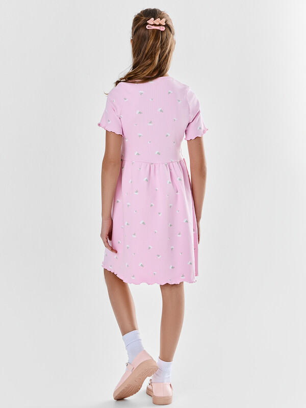 Платье отрезное, чуть выше талии, со сборкой. Рукав втачной, короткий. Длина выше колена. Горловина круглой формы. Обтачка из основного полотна. Низ изделия и рукавов обработан на микрооврлоке.