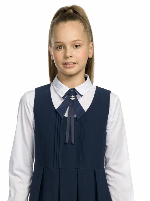 Сарафан для девочки в темно-синем цвете. Подойдет в качестве повседневного элемента школьной формы. Изделие соткано из двух частей, свободно сидит и не имеет застежки. Грудка декорирована вертикальными строчками, а в юбку заложено шесть складок, чтобы сделать изделие комфортным и свободным. Спинка цельная, книзу чуть расширяется, объем хорошо регулируется репсовой тесьмой, которую можно завязать на бант.