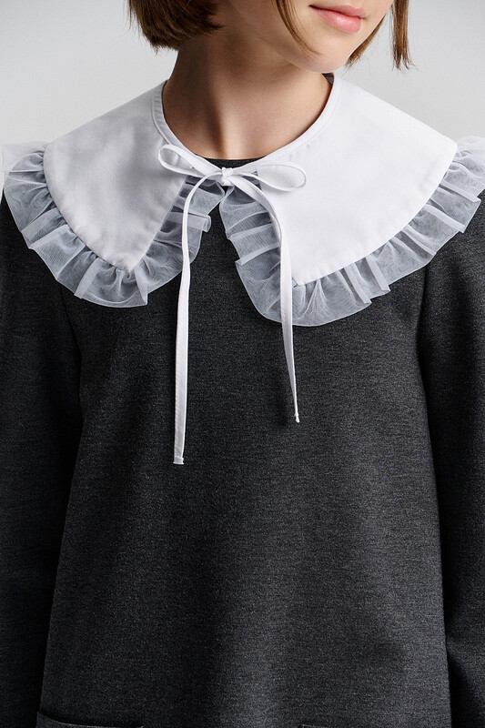Съёмный воротничок на мягких завязках, украшенный кружевом, превращает повседневный наряд в почти праздничный. Надо — носим с ним, хочется проще — легко снимается.