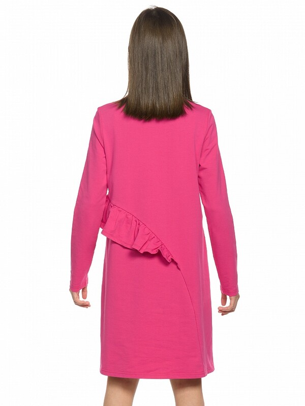 Платье для девочек из футера А силуэта. Аккуратный втачной рукав, небольшая горловина. Фишка декоративный асимметричный рельеф необычной округлой формы по переду и по спинке до низа изделия. В рельеф вставлен волан. Rubber принт с золотым металликом и глиттером. Надпись Чудеса случаются. Вуаля.