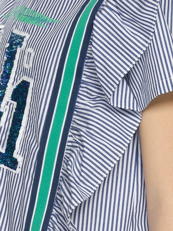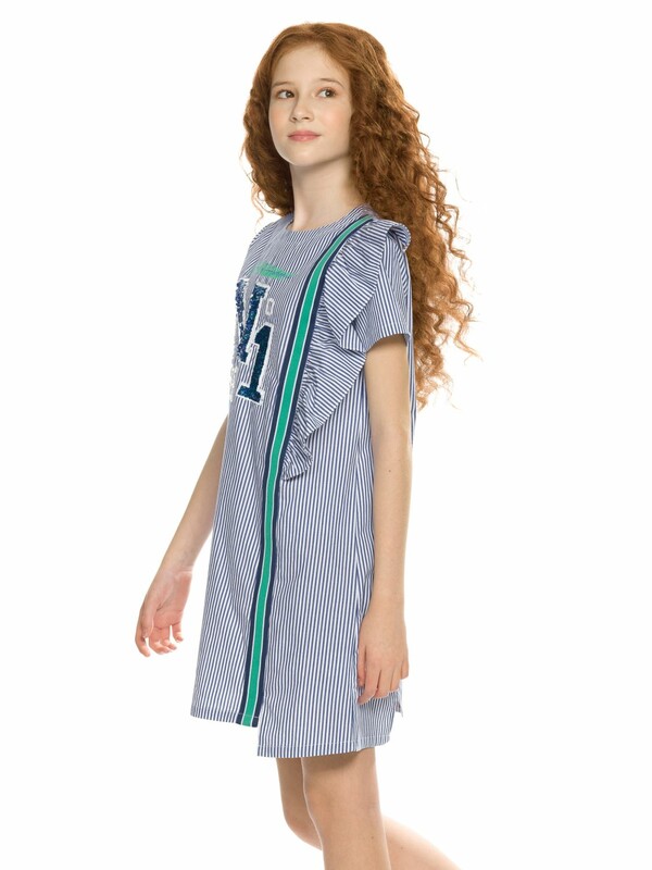 Платье для девочек. Новинка. Платье швейное из хлопка А-образного силуэта с укороченным рукавом. По левой половине изделия вертикальное членение, делящее модель по длине. Вдоль членения настрочена трикотажная декоративная тесьма и рюша из основной ткани. По спинке застежка на одну пуговицу. Декор - вышивка из переливающихся пайеток, перевод Будь первой , и художественным росчерком, перевод Делай это потрясно .