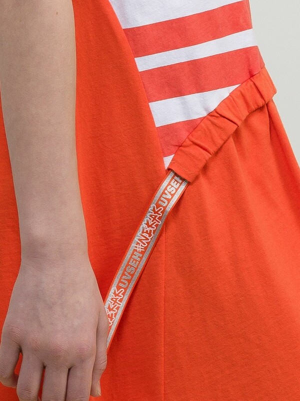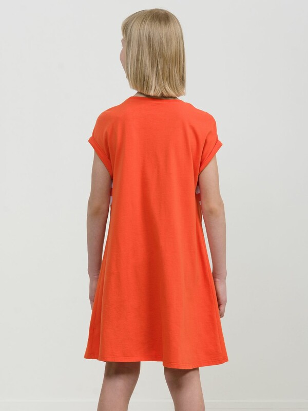 Платье для девочек. Оригинальное членение по низу изделия, присборенная вставка и кулиска, в которую продета принтованная серебряным металликом репсовая лента. Дополнительные рельефы в боковых швах делают актуальным силуэт платья. Rubber принт с бирюзовым металликом и черным глиттером. Перевод Не важно. будь.. крутым.