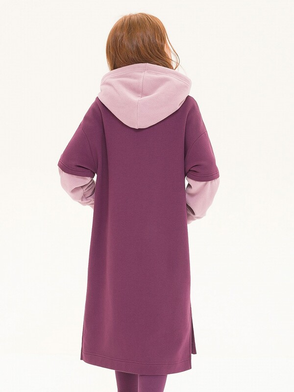 Платье с капюшоном для девочки оверсайз. Платье толстовка на девочку с длинным рукавом, свободного прямого кроя, удлиненное ниже колена, с разрезиками внизу, накладной карман кенгуру с принтом надпись. С эффектом многослойности - часть рукава и капюшон на шнуре выполнены из контрастного цвета. Базовый вариант детского гардероба из бербер-флиса для осени и зимы. Для современных девочек комфортная и универсальная свободная детская одежда вышла на первый план. Просторное теплое детское спортивное платье для подростка не сковывает движений, в нем удобно бегать, прыгать при этом выглядеть по-девичьи. Утепленное платье создано для активной жизни ребенка. Зимнее платье идеальный вариант для детей для повседневной носки на каждый день, подойдет на прохладную погоду, в нем можно много гулять, а от ветра защитит капюшон.