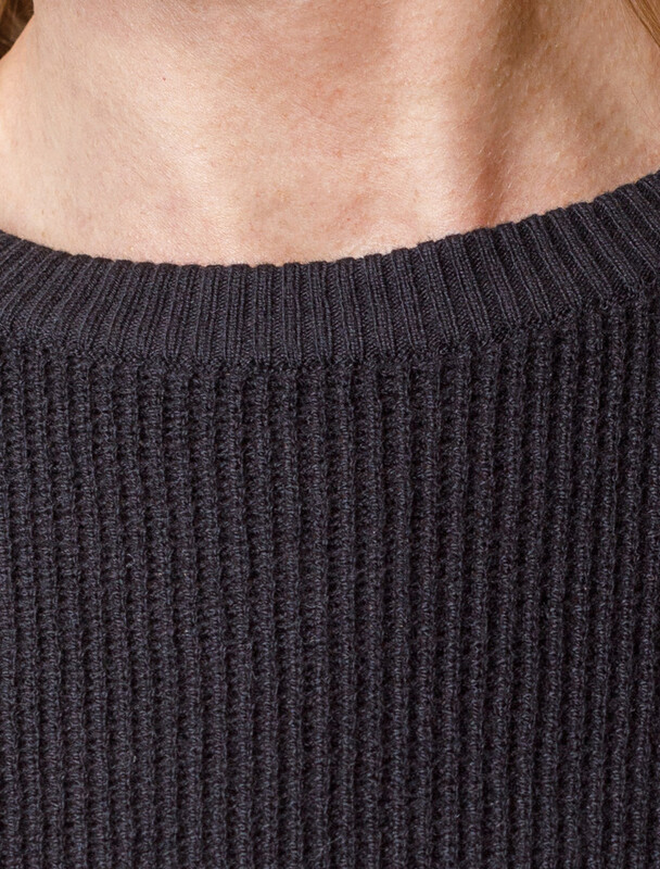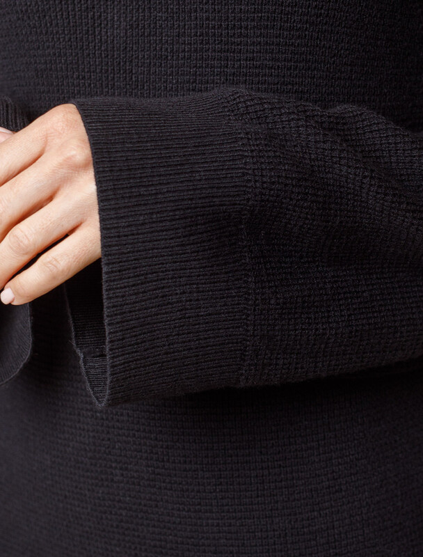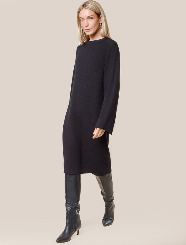 Платье прямого силуэта фактурной вязки выполнено из хлопка с добавлением кашемира.