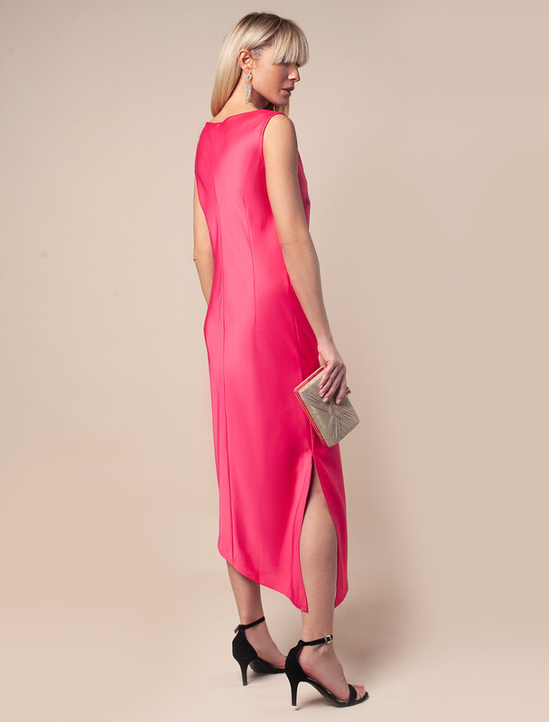 Платье с горловиной формы лодочка выполнено из плотного полуматового сатина, напоминающего натуральный шёлк. Лаконичная модель дополнена ассиметричным низом с разрезом, скроенная по косой струится и переливается при каждом шаге. Ткань почти не мнется и имеет легкий вес. Роскошная модель для праздничного мероприятия, хорошо будет сочетаться с жакетом или кожаным верхом.