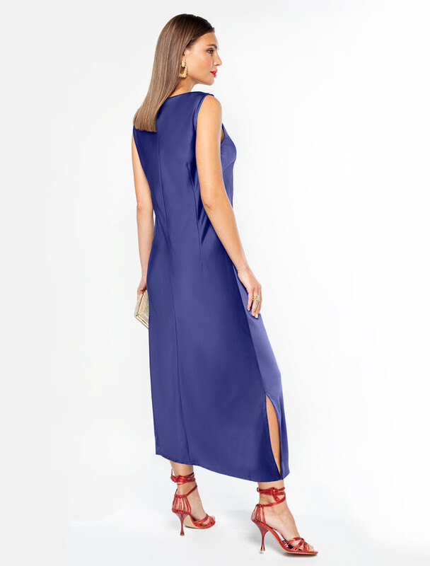 Платье с горловиной формы лодочка выполнено из плотного полуматового сатина, напоминающего натуральный шёлк. Лаконичная модель дополнена ассиметричным низом с разрезом, скроенная по косой струится и переливается при каждом шаге. Ткань почти не мнется и имеет легкий вес. Роскошная модель для праздничного мероприятия, хорошо будет сочетаться с жакетом или кожаным верхом.