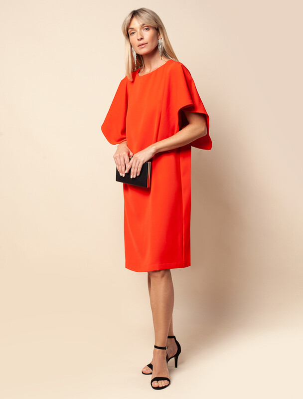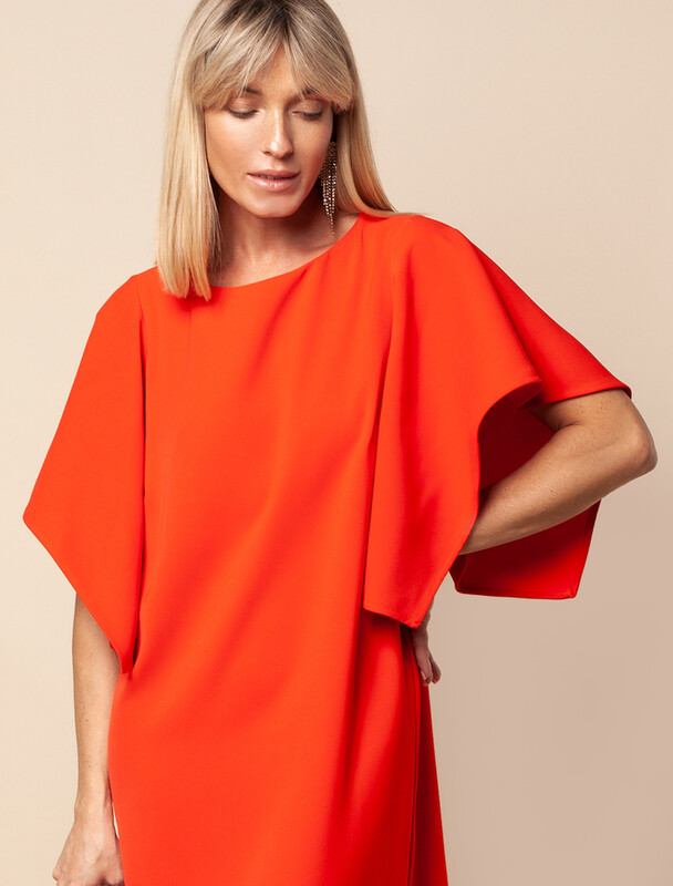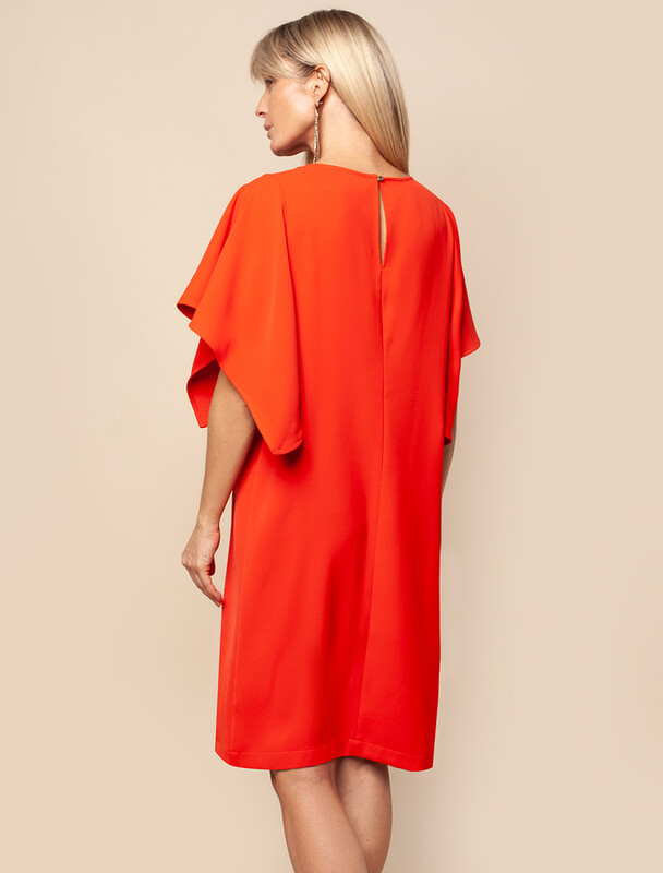Платье из плотного струящегося крепа прямого кроя с «парящими» рукавами. Фасон платья сбалансирует любой тип фигуры: прямой свободный крой, универсальная длина подола – чуть ниже колена, широкая пройма и акцентные рукава. Классический О-образный вырез фиксируется сзади изящной золотой пуговицей. Материал почти не мнется и комфортен в носке.