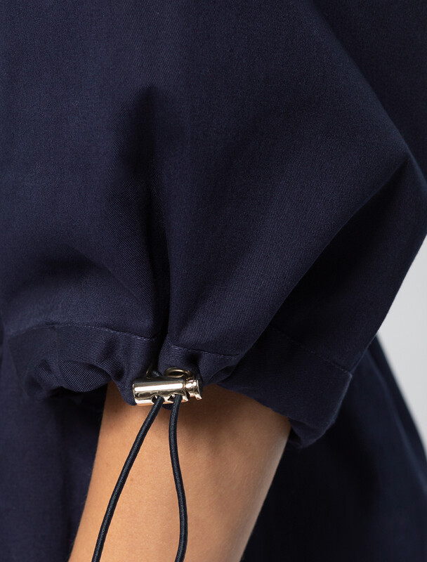 Платье в стиле сафари выполнено из тонкого хлопкового твила. Пышные рукава и пояс на кулисе с регуляторами. Модель дополнена боковыми карманами и застежкой на золотистые пуговицы. Благодаря наличию эластана в составе, изделие сохранит свой безупречный внешний вид в течении долгого времени. Обладает высокой воздухопроницаемостью, благодаря в платье будет комфортно даже в жаркое время года.