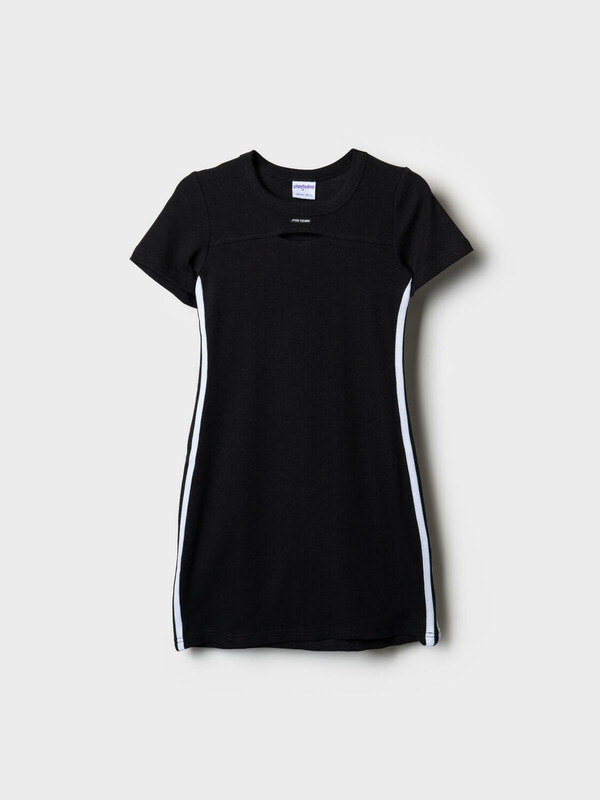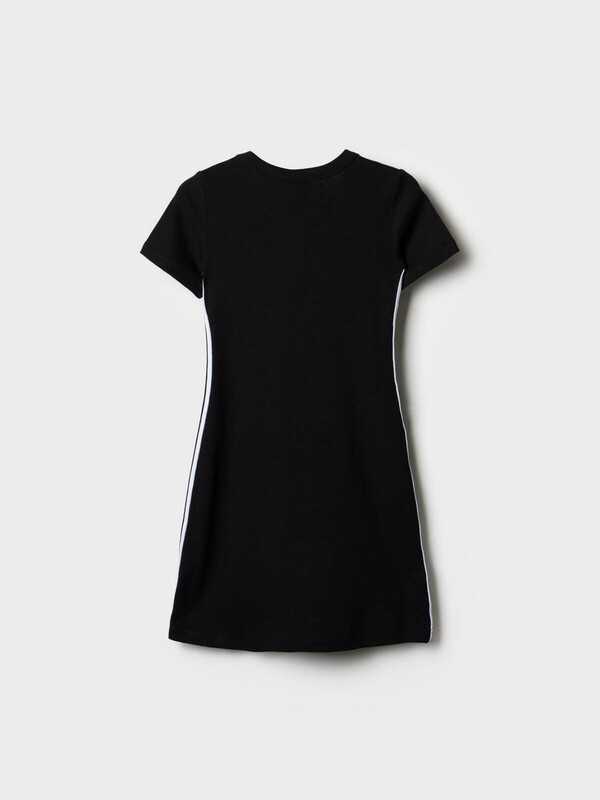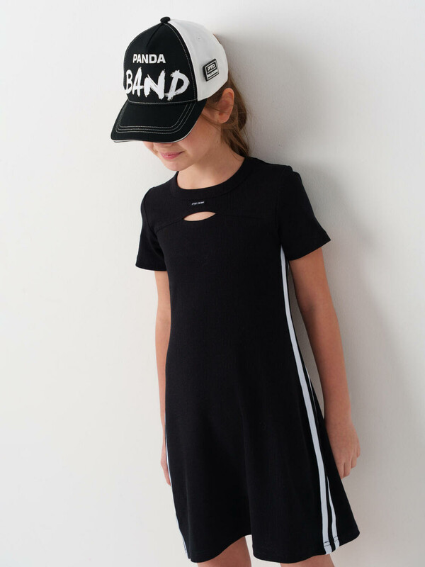 Трикотажное платье для девочки подростка. Выполнено из хлопкового эластичного риба и имеет облегающий крой и длину выше колена. У платья круглый вырез и короткий рукав. На груди небольшой вырез и вышивка. По бокам декоративные лампасы.