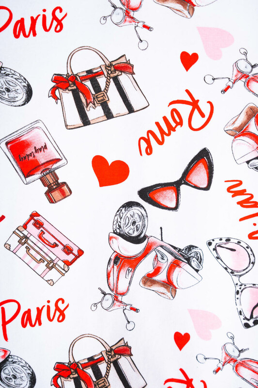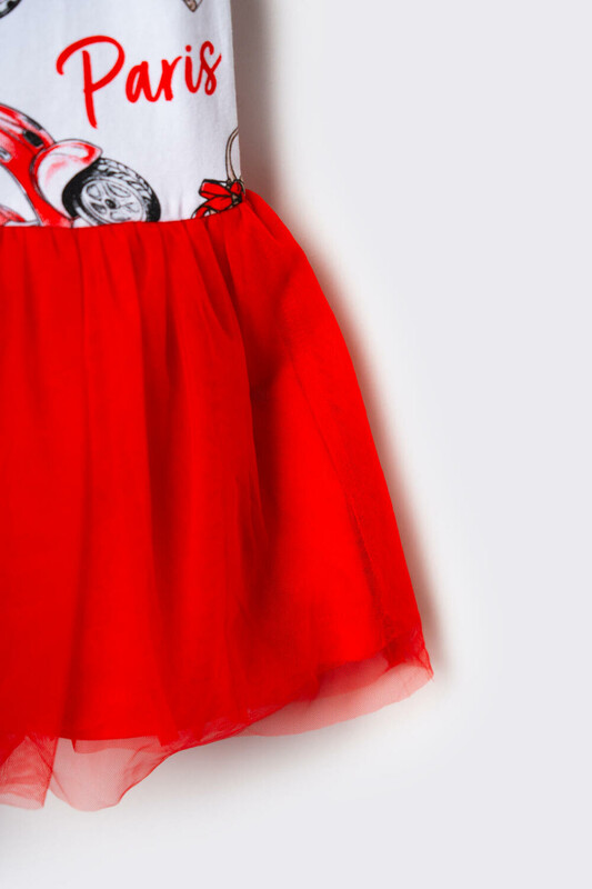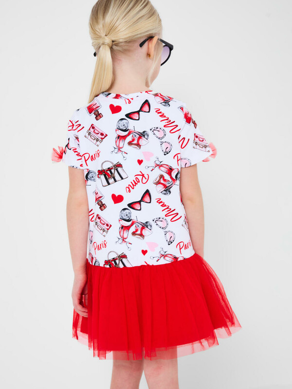Лёгкое детское платье для девочки. Выполнено из мягкого хлопкового трикотажа джерси. Верхняя часть — как футболка с короткими рукавами и круглым вырезом, украшена ярким принтом с модными элементами и надписями. Рукава дополнены декоративными бантиками. Низ изделия — двухслойная юбка насыщенного красного цвета: верхний слой из сетки добавляет воздушности, нижний — из мягкого трикотажа для комфорта.