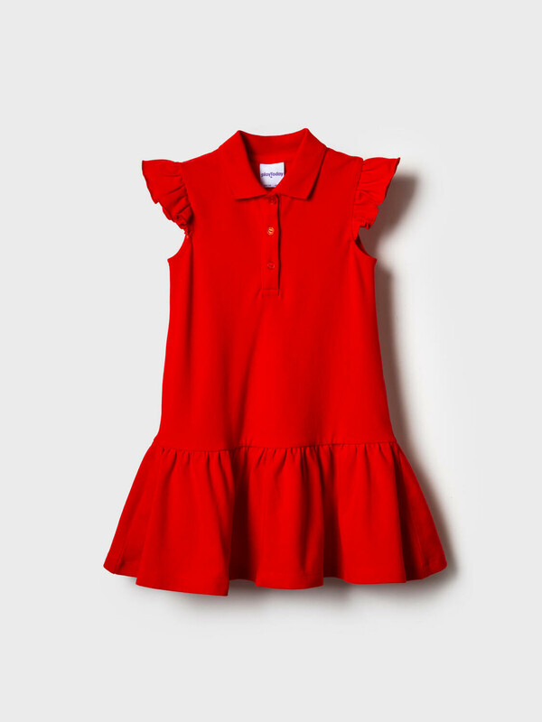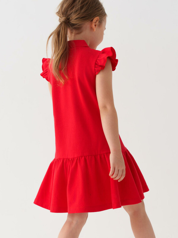 Летнее детское платье-поло для девочки. Выполнено из мягкого хлопкового трикотажа пике. Короткие рукава-крылышки, классический воротник поло и застежка на кнопки спереди. По низу — присборенная юбка, создающая нежный силуэт.