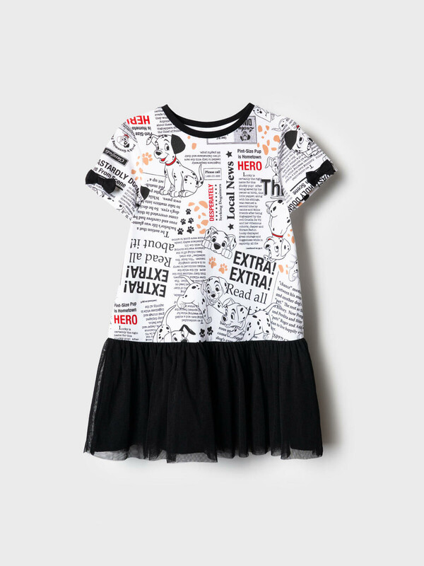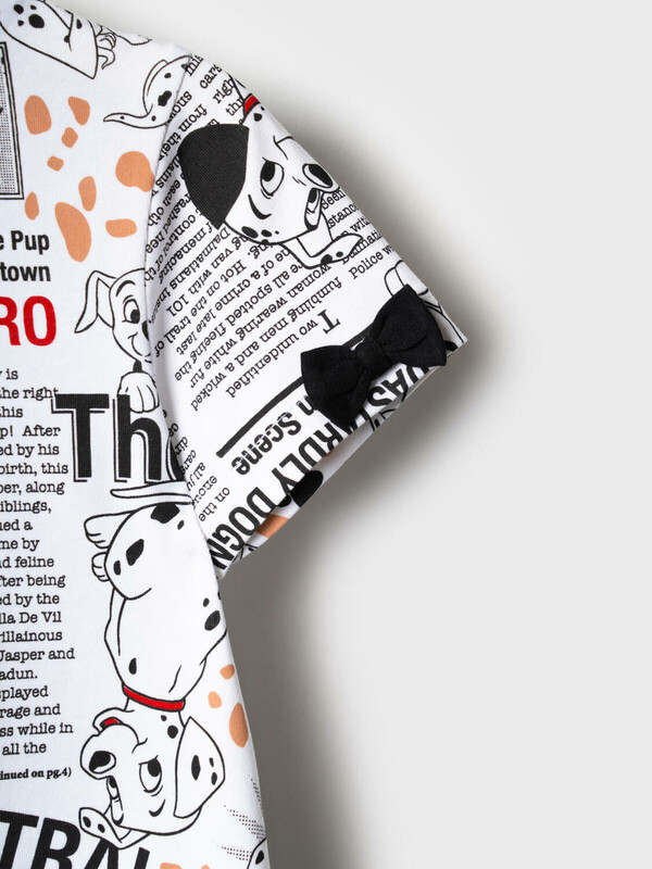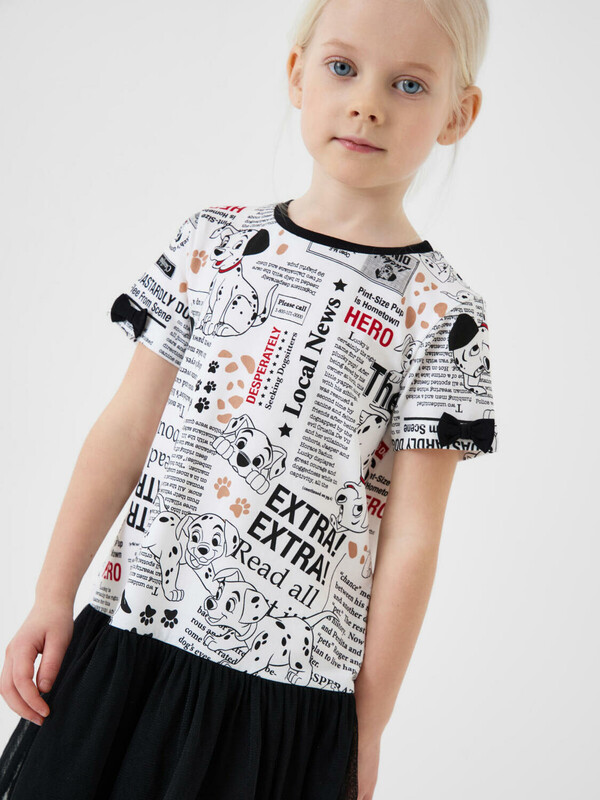 Легкое детское платье для девочки. Верхняя часть — выполнена как футболка с коротким рукавом и круглой горловиной из хлопкового трикотажа джерси, нижняя — пришитая юбка из ткани и сетки. На рукавах — декоративные бантики. Основной акцент сделан на ярком принте с героями любимого мультфильма "101 далматинец" и газетными текстами.