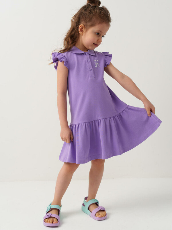 Летнее детское платье-поло для девочки. Выполнено из мягкого хлопкового трикотажа пике. Короткие рукава-крылышки, классический воротник поло и застежка на кнопки спереди. По низу — присборенная юбка, создающая нежный силуэт. Милый принт с медведем.