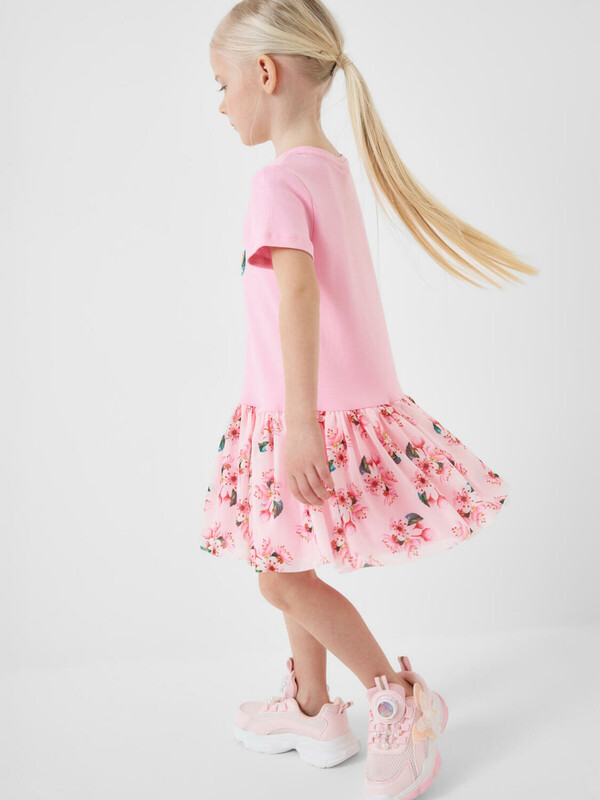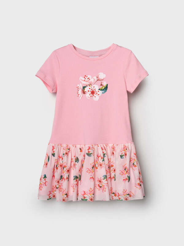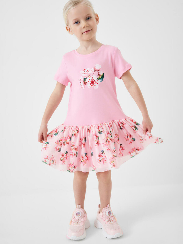 Нарядное детское платье для девочки. Модель из комбинации хлопкового трикотажа интерлок и сетки. Верх выполнен в виде футболки в нежно-розовом цвете и украшен ярким цветочным принтом на груди. Пышная юбка с цветочным рисунком собрана по талии и придаёт изделию нарядный вид.