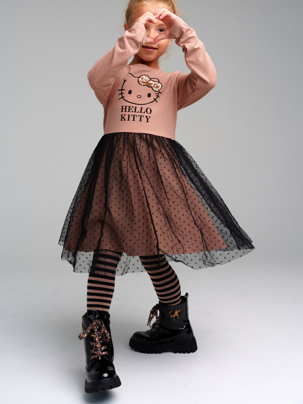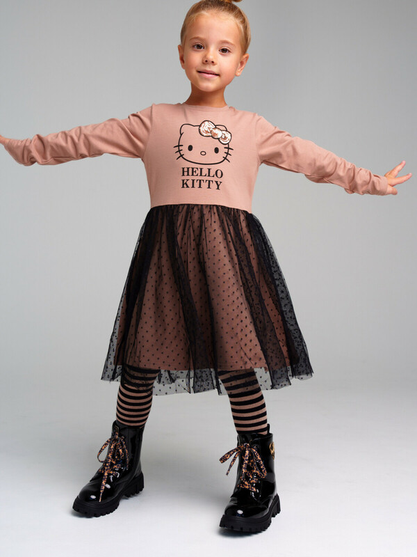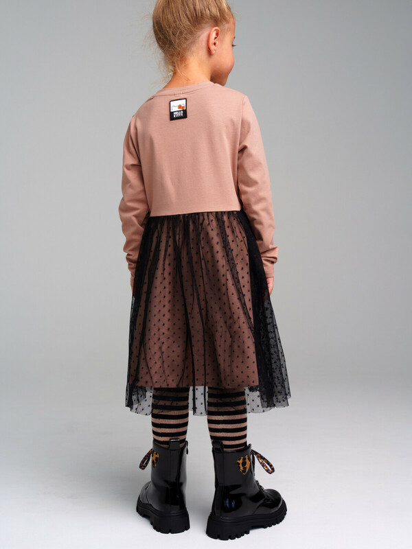 Платье трикотажное с юбкой из мягкой сетки. Верх платья из трикотажа с высоким содержанием хлопка 95%. Благодаря наличию 5% эластана в составе ткани изделие держит форму.