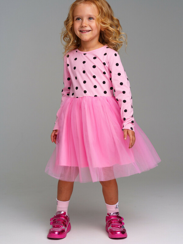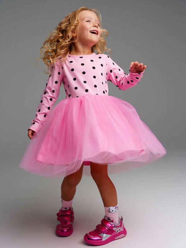 Платье трикотажное с юбкой из мягкой сетки. Верх платья из трикотажа с высоким содержанием хлопка 95%. Благодаря наличию 5% эластана в составе ткани изделие держит форму.