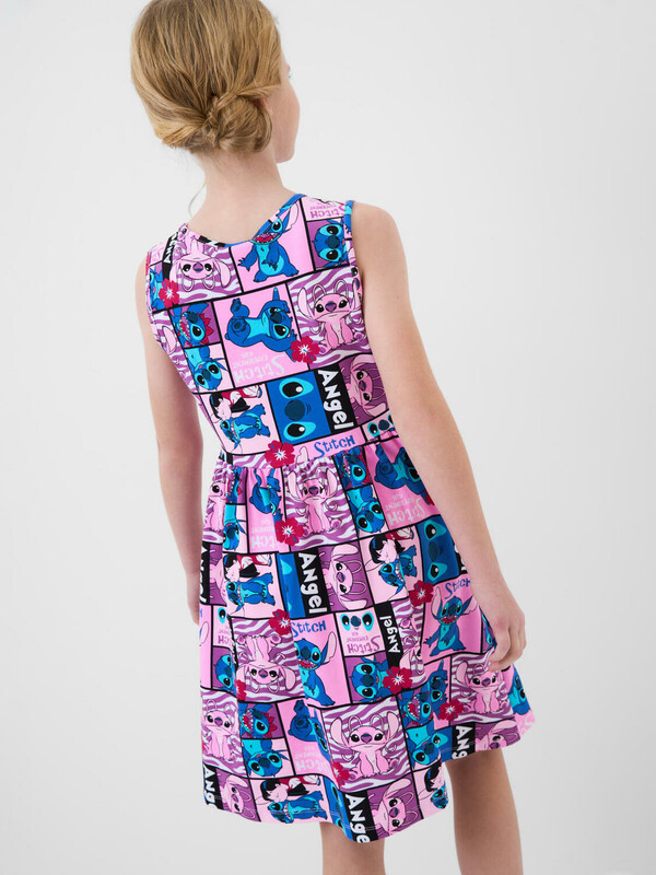 Лёгкое платье для девочки подростка. Модель средней длины — до колена, с круглой горловиной и присборенной юбкой. Выполнено из мягкого хлопкового трикотажа джерси. Платье украшено ярким принтом с любимыми персонажами мультфильма "Лило и Стич", а также надписями и декоративными цветами.