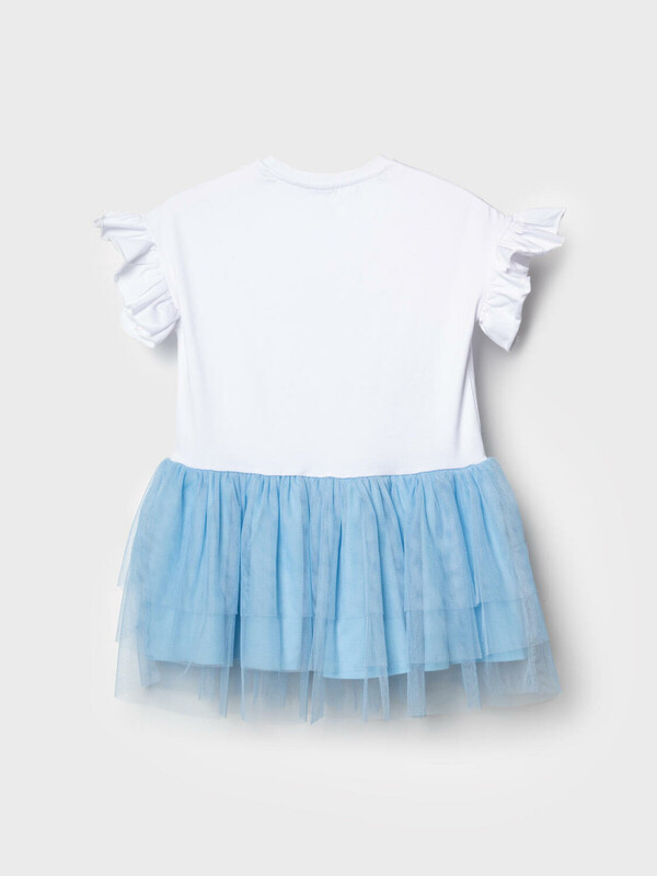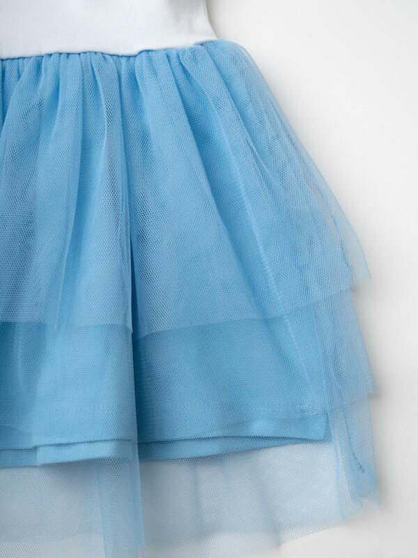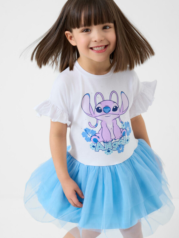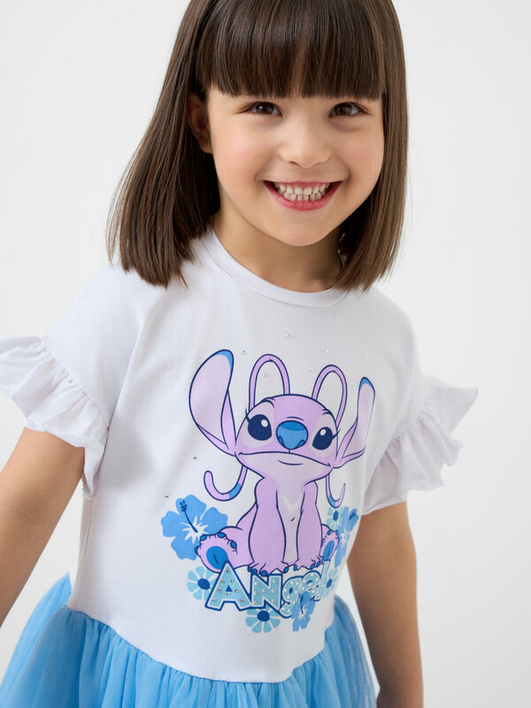 Нарядное детское платье для девочки. Модель из комбинации хлопкового трикотажа джерси и сетки. Верх выполнен в виде футболки с круглой горловиной и сборками на рукавах. Пышная юбка из сетки придаёт изделию нарядный вид. Украшено ярким принтом с героем любимого мультфильма "Лило и Стич".