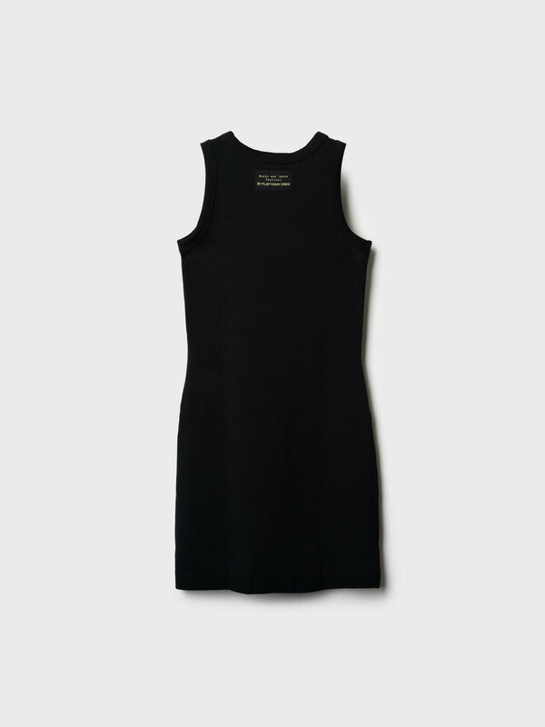 Трикотажное платье для девочки подростка. Выполнено из хлопкового эластичного риба и имеет облегающий крой и длину мини. У платья круглый вырез и аккуратная обработка пройм. Внизу изделия размещена декоративная жаккардовая нашивка.