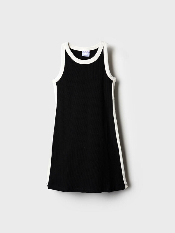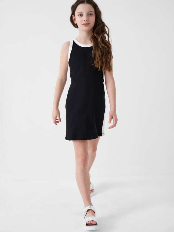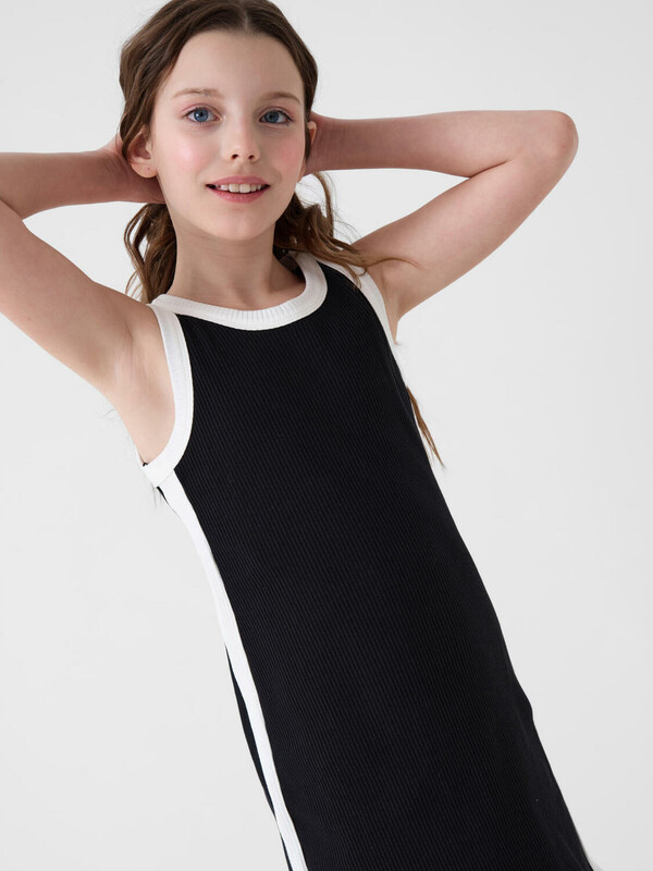 Облегающее трикотажное платье для девочки подростка. Модель длины мини, приталенная, с лампасами, которые визуально вытягивают силуэт. Выполнена из хлопкового трикотажа в рубчик.