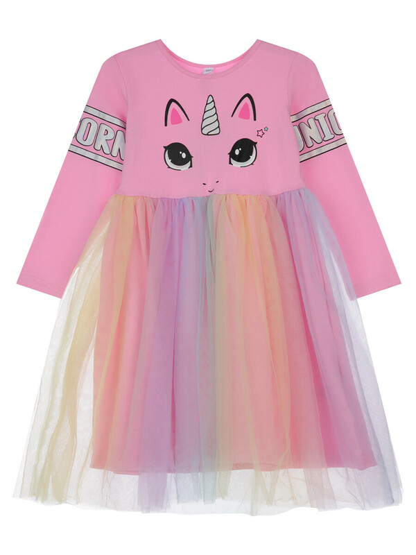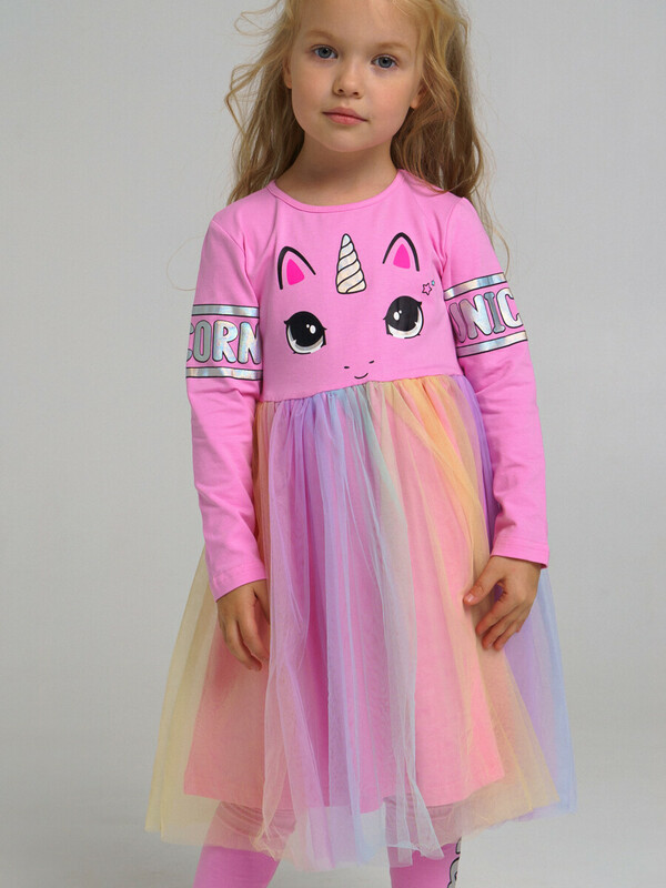 Платье трикотажное с длинным рукавом. Размер изделия на фото - 110, параметры модели (см): рост 104,5, обхват груди-талии-бедер: 53,5-57-53,5. Высокое содержание хлопка 95%. Благодаря наличию эластана в составе ткани изделие держит форму и меньше мнется. Верхняя юбка из сетки с градиентом.