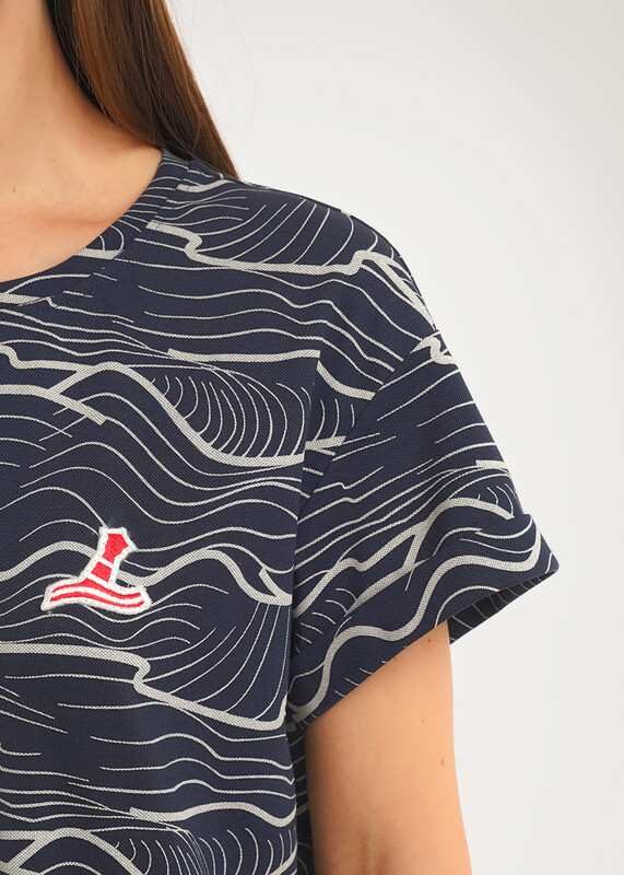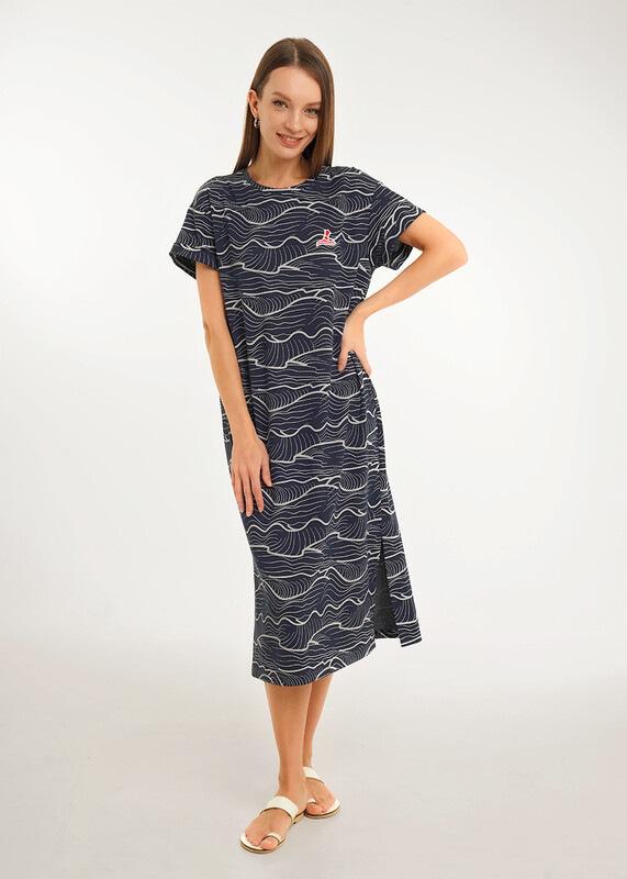 Платье для дома и отдыха прямого силуэта из трикотажного полотна пике. Втачной короткий рукав внизу с отворотом. Округлая горловина с обтачкой. Спереди нашивка. Боковые разрезы.