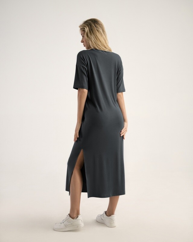 Платье, длина макси с высоким разрезом в левом боковом шве. Спущенное плечо.Втачной короткий рукав. V- вырез.Горловина окантована бейкой из основной ткани.