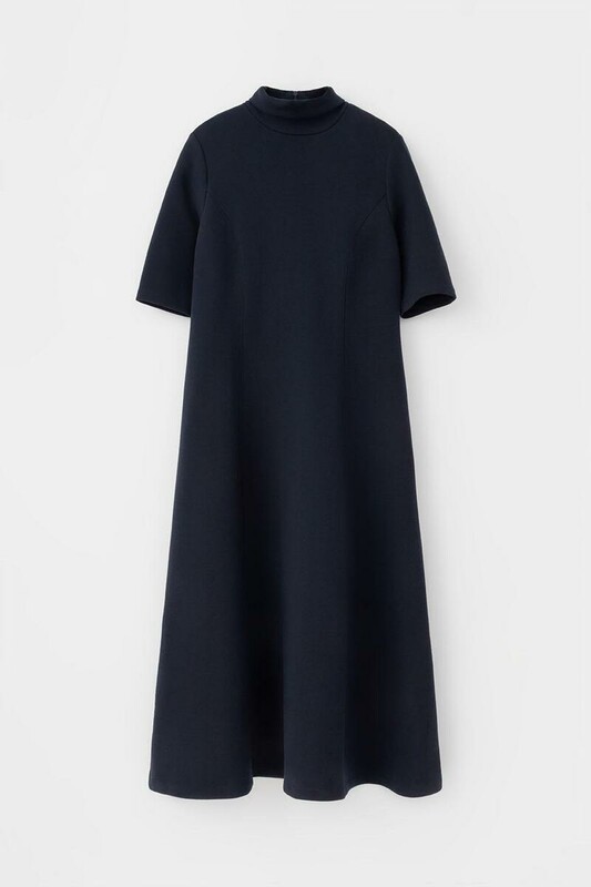 Платье с воротником-стойкой и короткими рукавами из плотного трикотажа интерлок.