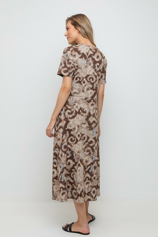 Платье с круглым вырезом и короткими рукавами из плотного набивного трикотажа интерлок. Модель с трапециевидной юбкой и боковыми карманами.